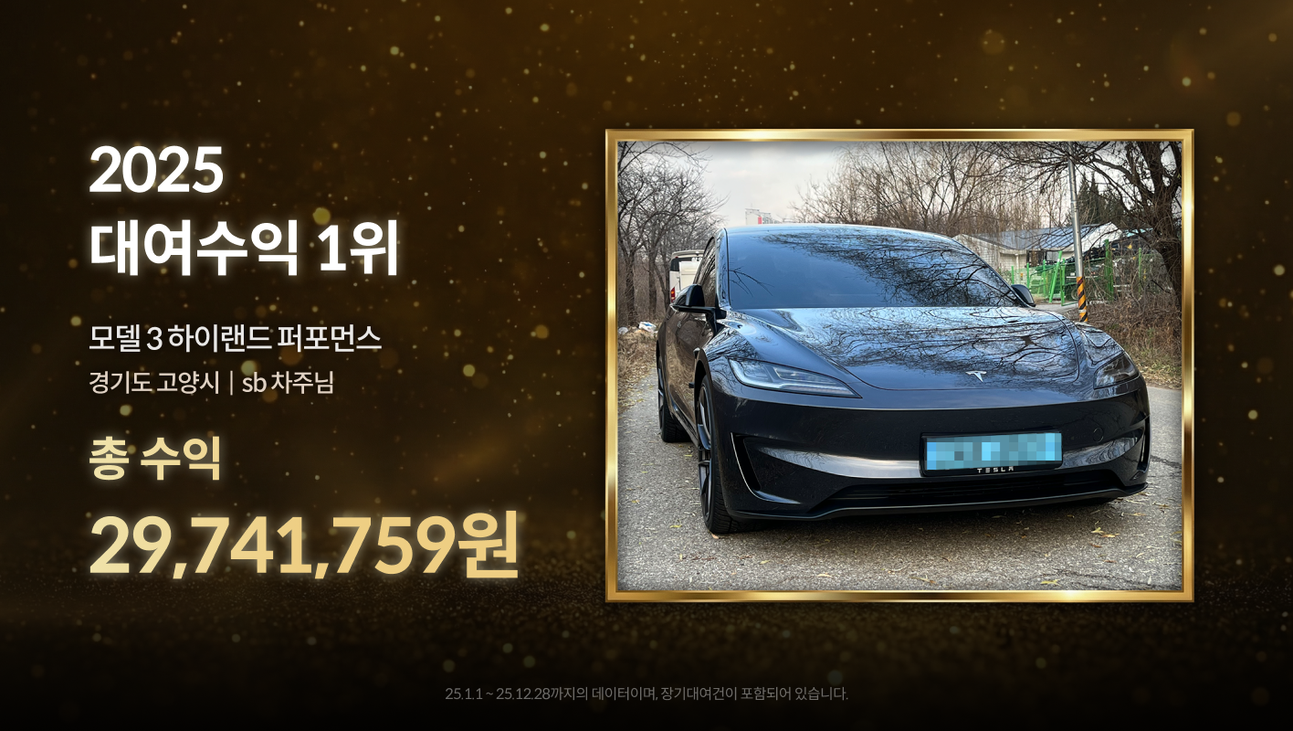 타운카에서 2025년 올 한 해 동안 가장 높은 매출을 낸 차량은 바로 경기도 고양시 sb(닉네임)차주님의 테슬라 모델 3 하이랜드 퍼포먼스 모델입니다. 2025년 총 수익이 무려 삼천만원에 육박하는 29,741,759원인데요!