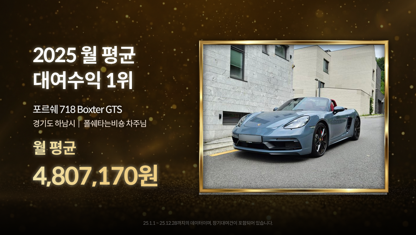 수익 1위가 모델 3 퍼포먼스 차량이라면, 월 평균 대여수익 1위는 바로 하남시 폴쉐타는비숑 차주님의 포르쉐 718 Boxter GTS 차량입니다!
