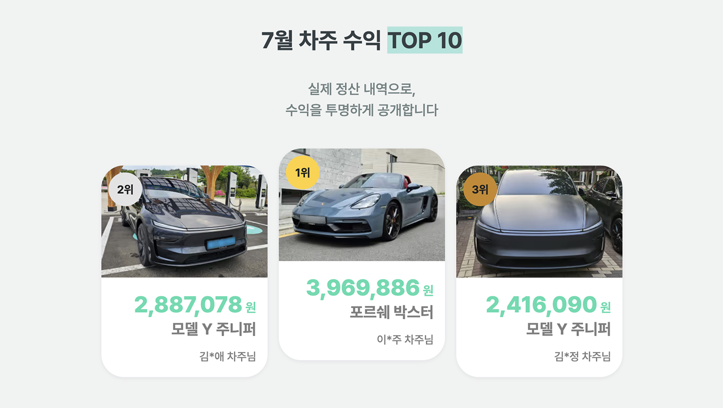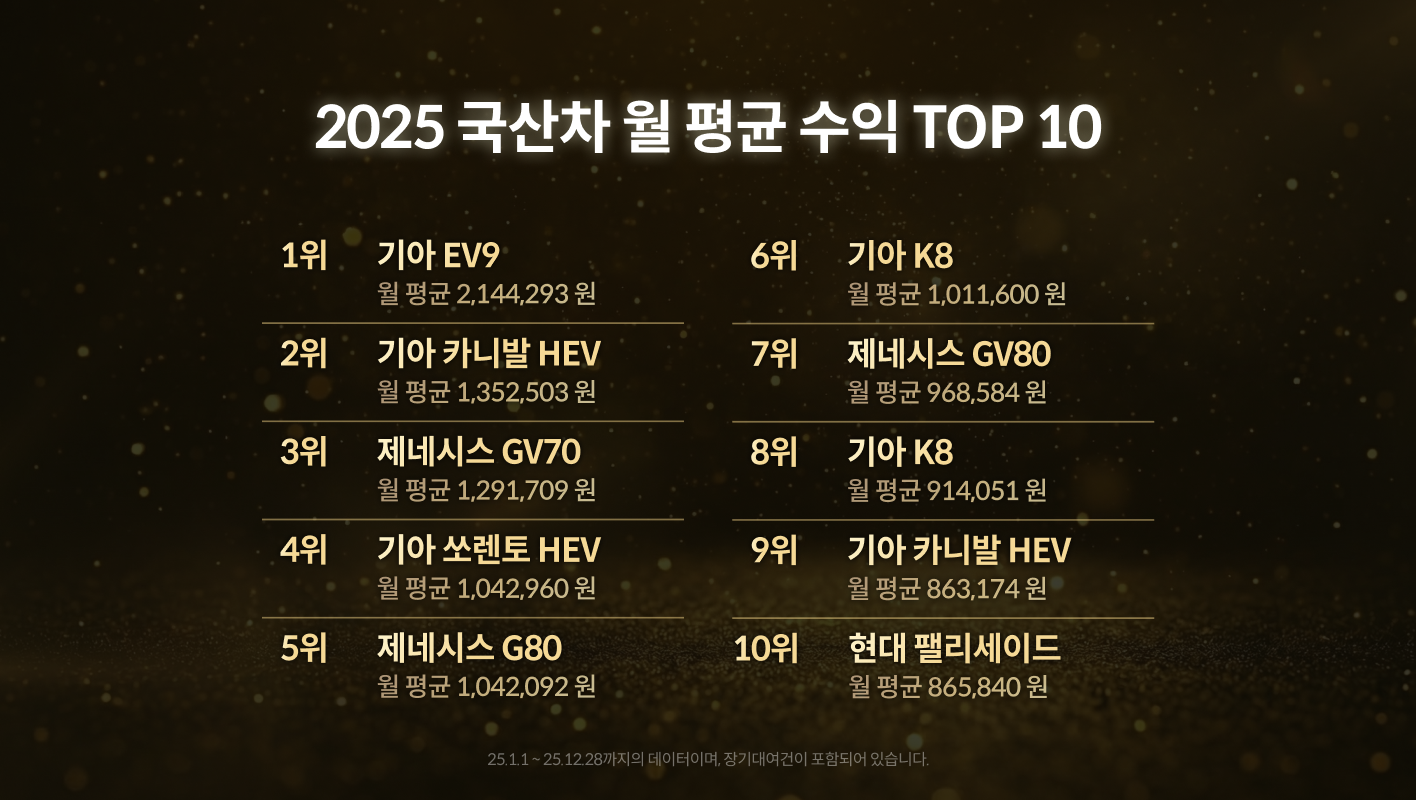 2025년 총 수익 TOP 10에 국산차가 안보여서 실망하실까봐 국산차 월 평균 수익 TOP 10도 준비해봤습니다. 최근에 등록된 최신 차량들의 동향도 알려드리고 싶어서 월 평균 수익으로 준비해봤는데요,