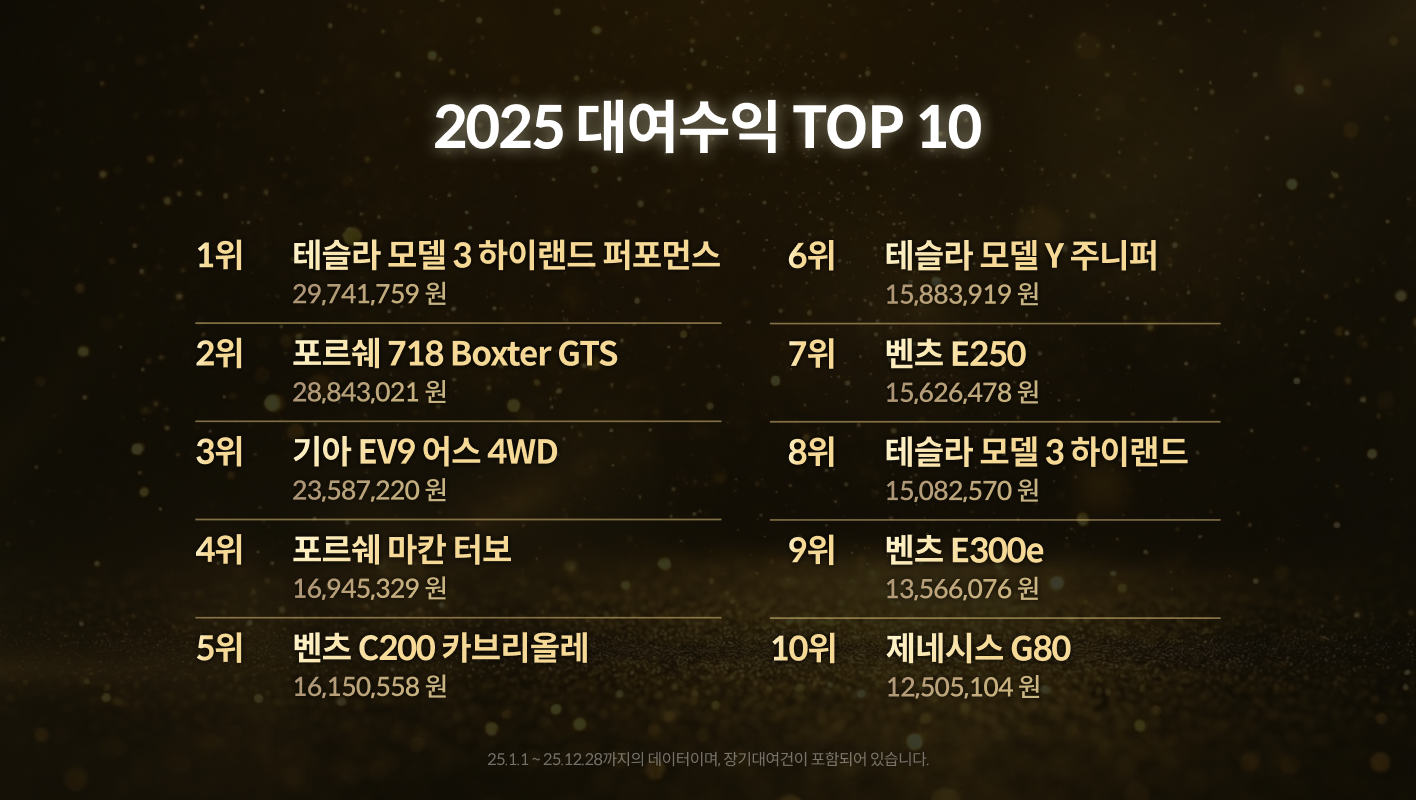 2025년 1년 간의 실제 데이터로 보는 타운카 연간·월평균 대여수익 TOP 10부터 차종·지역별 순위까지! 내 차를 공유해 수익으로 바꾸는 방법을 확인해보세요.