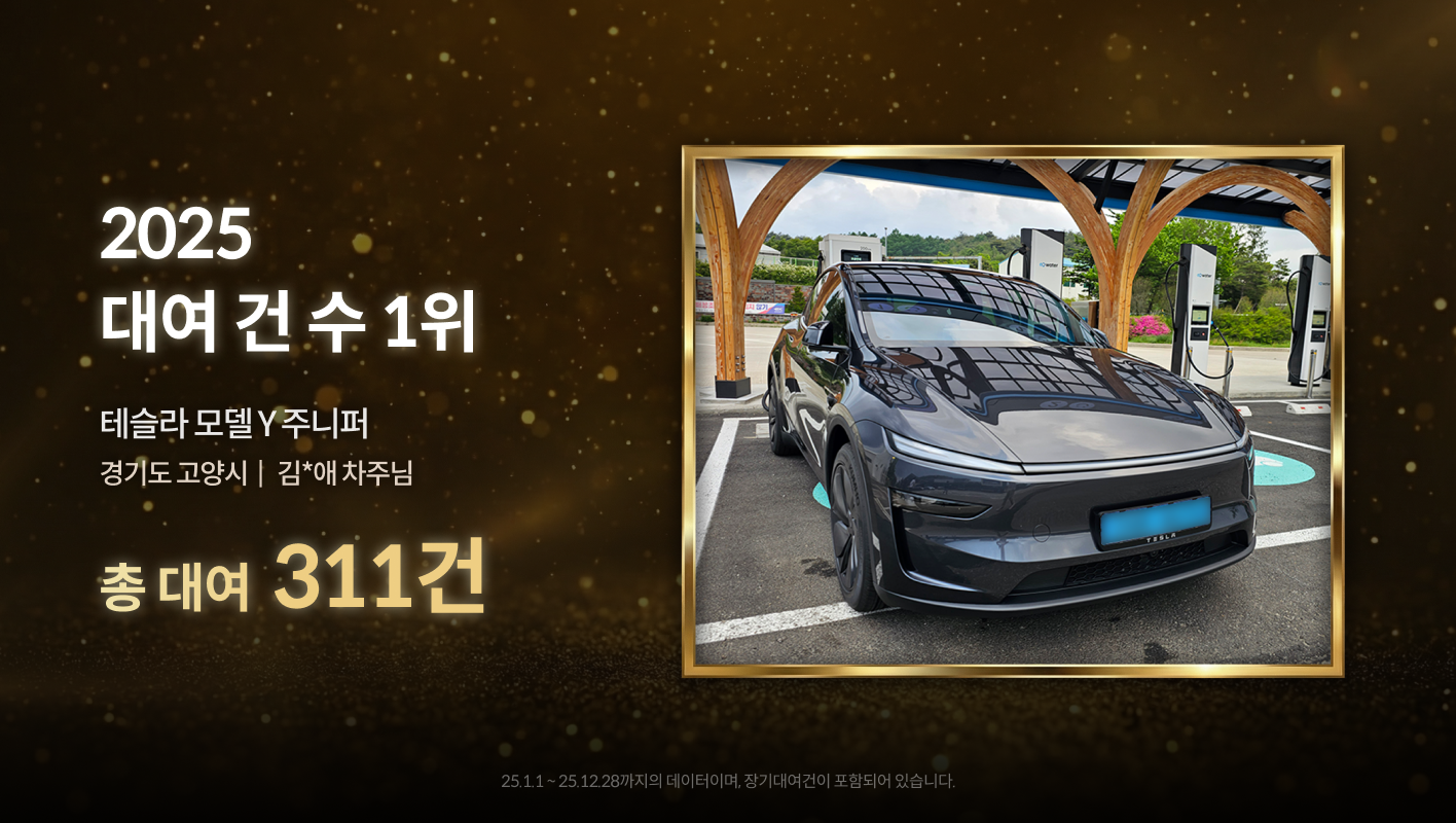 다음은 올 한 해 가장 많은 대여 건 수를 기록한 차량입니다! 바로 고양시 김*애 차주님의 테슬라 모델 Y 주니퍼 차량인데요! 무려 311건입니다! 이 차주님은 지난 4월 타운카에 가장 먼저 모델 Y 주니퍼를 등록하시며 쏟아지는 대여요청과 수익을 가져가셨습니다! 바쁘실때는 하루 4건까지도 하셨다고 들었습니다.👍