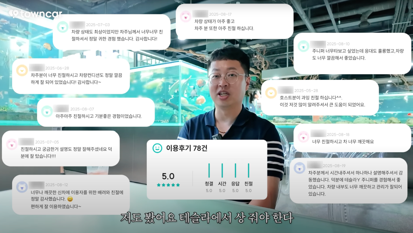 차주님은 심지어 차를 대여 할 때마다 친절한 설명과 함께 차량에 대한 지식을 알려주시며 유저분들의 후기중에는 테슬라 코리아에서 상줘야 한다는 이야기도 있었는데요, 차주님께서는 타운카 유튜브에도 출연하시며 높은 수익과 운영 노하우를 알려주시기까지 했습니다.