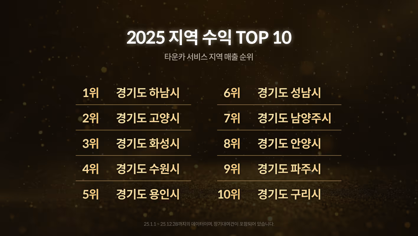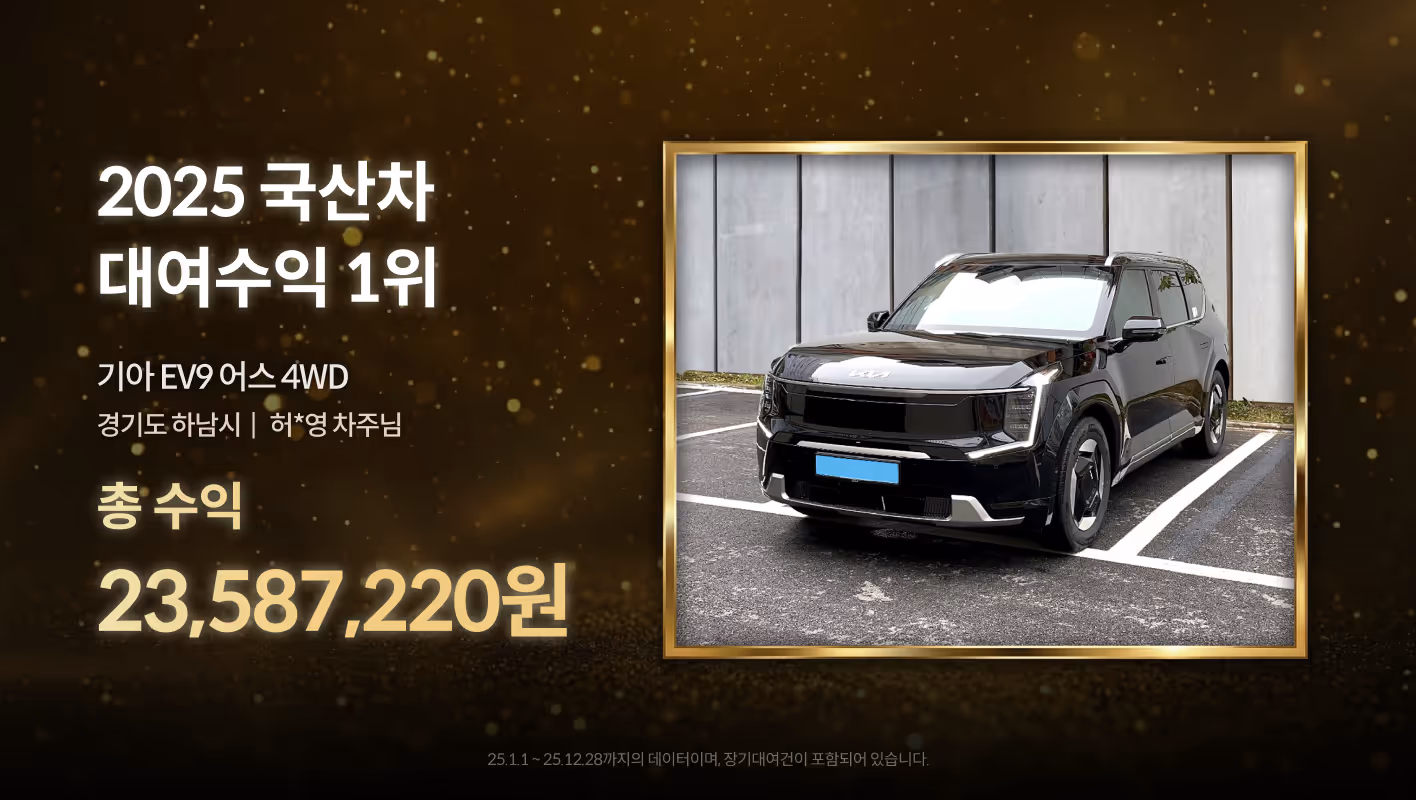 2025년 실제로 타운카에서 차량을 공유한 차주님들은 얼마나 벌었을까요? 2025년 한 해 동안 타운카 플랫폼에서 가장 높은 수익을 올린 차주님들의 실제 데이터를 공개합니다.