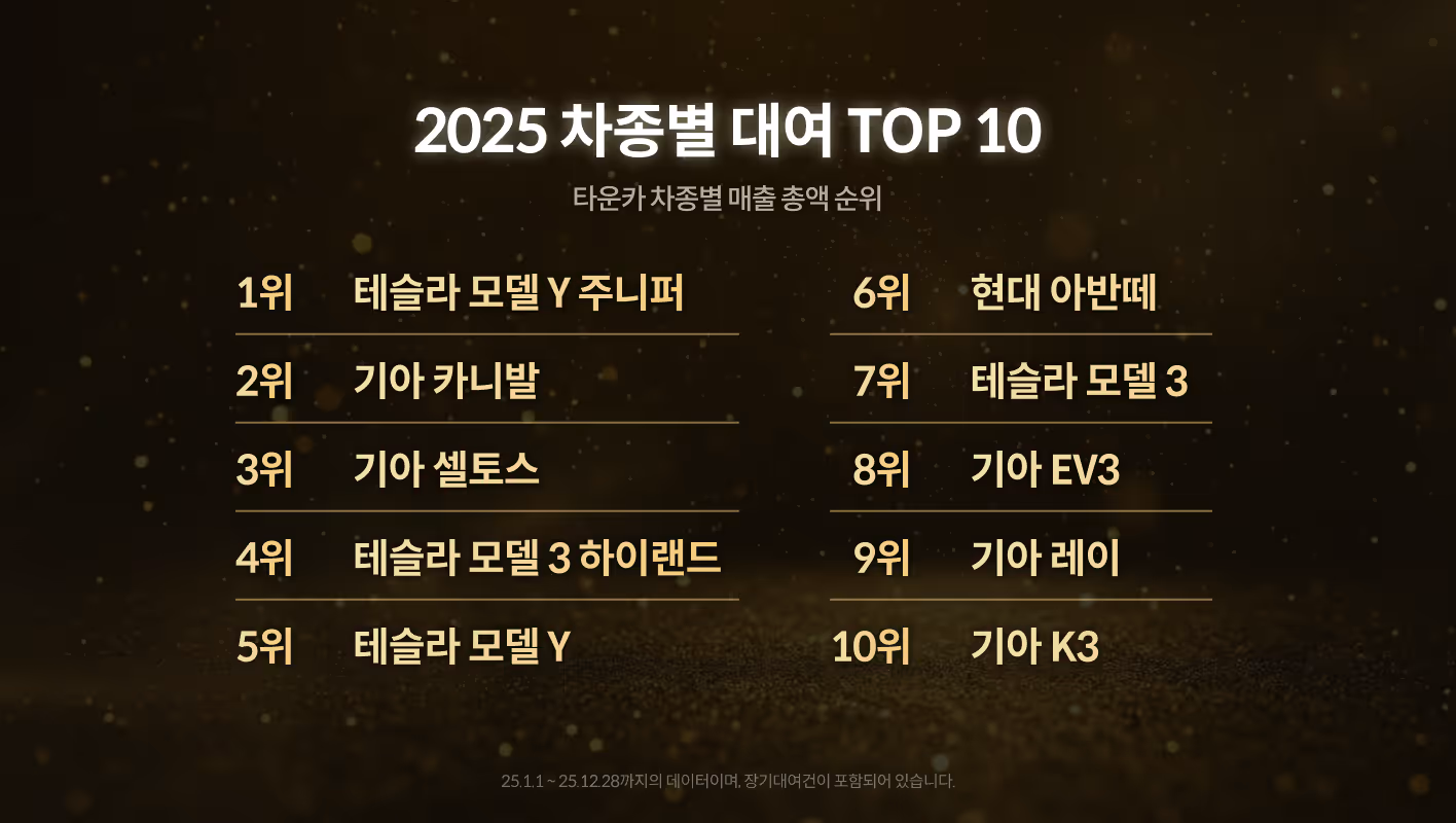 또 다른 포인트는 대여수익 TOP 10과는 다르게, 차종별 전체 매출 순위에서는 카니발, 셀토스 같은 일상적이고 이용하기 편리한 생활형 차량들이 높은 순위권에 자리잡은 것을 확인하실 수 있다는 점 입니다.