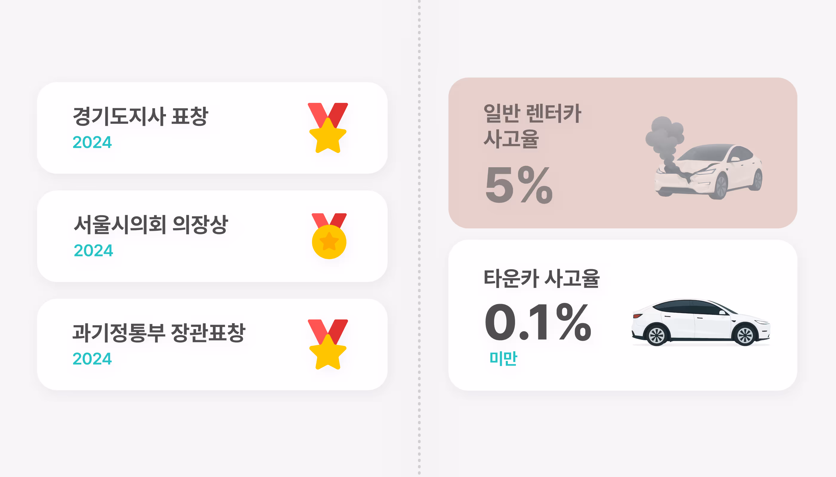 혹시 P2P 차량공유가 “과연 안전할까?”라는 의문이 드신다면, 경기도에서 이미 진행된 사례가 가장 확실한 답입니다. 타운카는 2021년 과학기술정보통신부의 규제샌드박스 승인을 받아 시범 운영을 시작했고, 지금까지 중대 사고율 0%, 분쟁 발생 비율도 렌터카나 기존 카셰어링보다 낮게 기록했습니다.