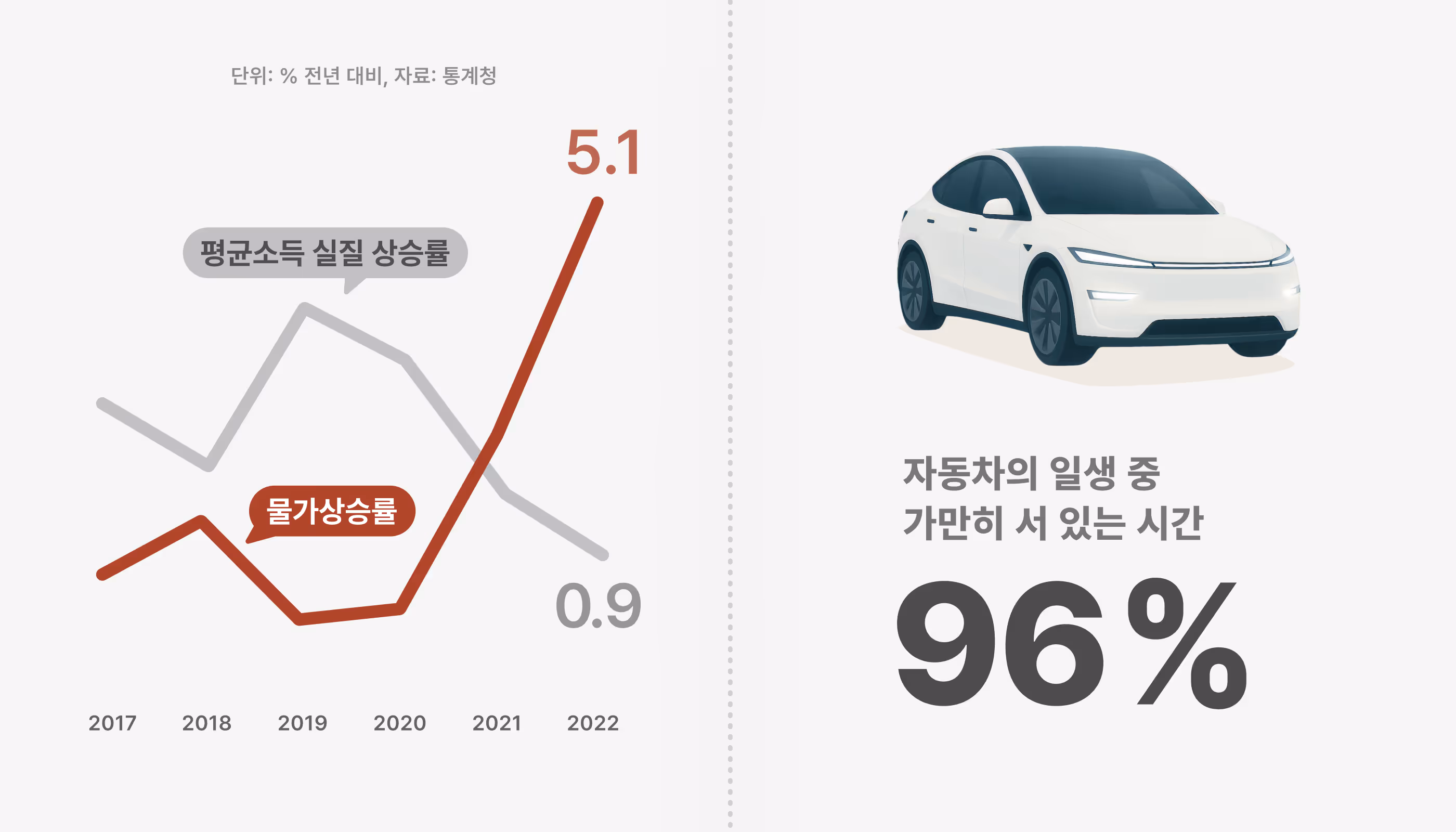 여기에 더해 요즘처럼 물가가 치솟는 시기에는 차 유지비가 큰 부담으로 다가옵니다. 보험료, 자동차세, 주차비, 관리비까지 빠짐없이 챙겨 내야 하지만 정작 하루 종일 차는 아파트 지하주차장에 세워져 있는 경우가 많습니다. 사실상 자산이라기보다 비용으로만 느껴지는 순간이 많아지는 거죠.