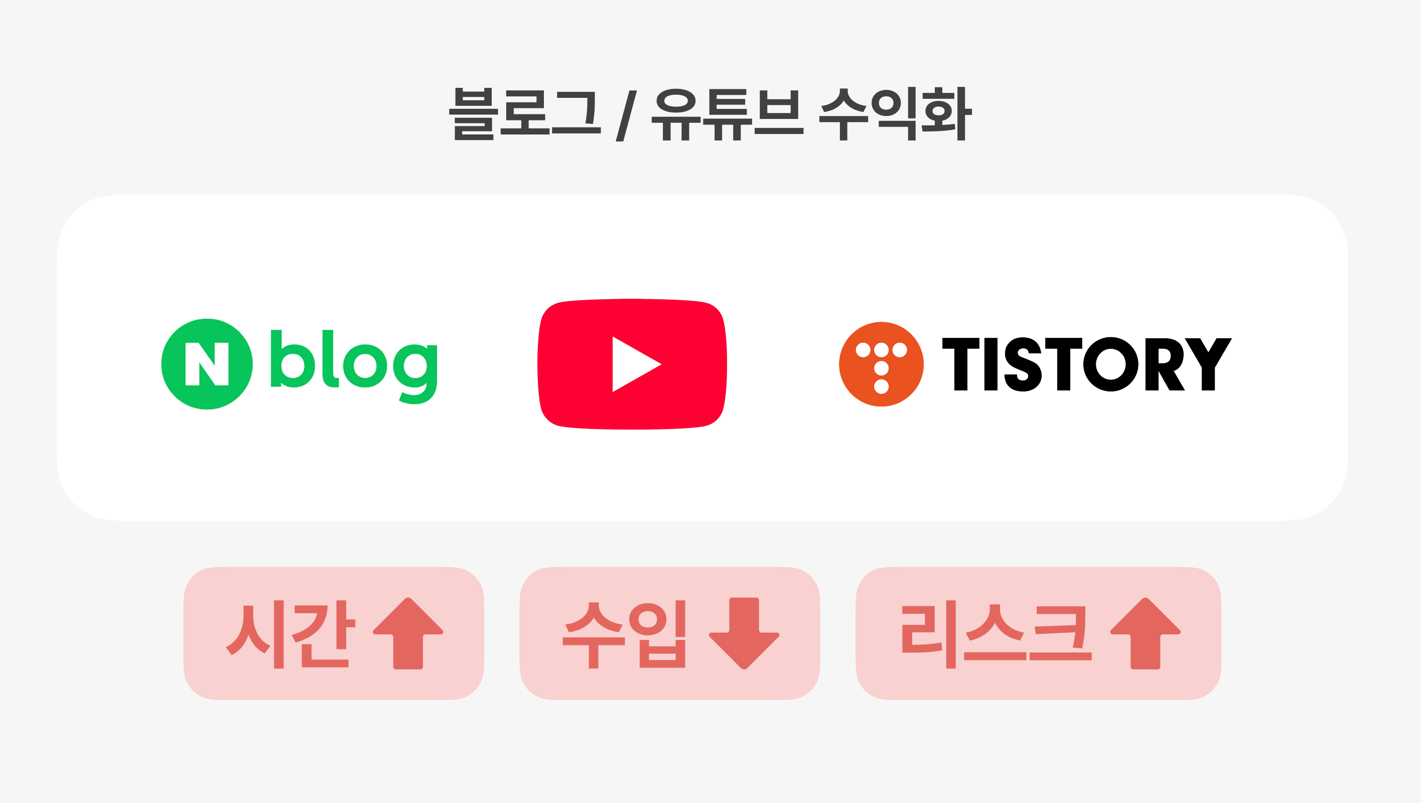 콘텐츠를 만들어 광고 수익을 얻는 방식입니다. 진입은 쉽지만 수익화까지의 거리가 멉니다.