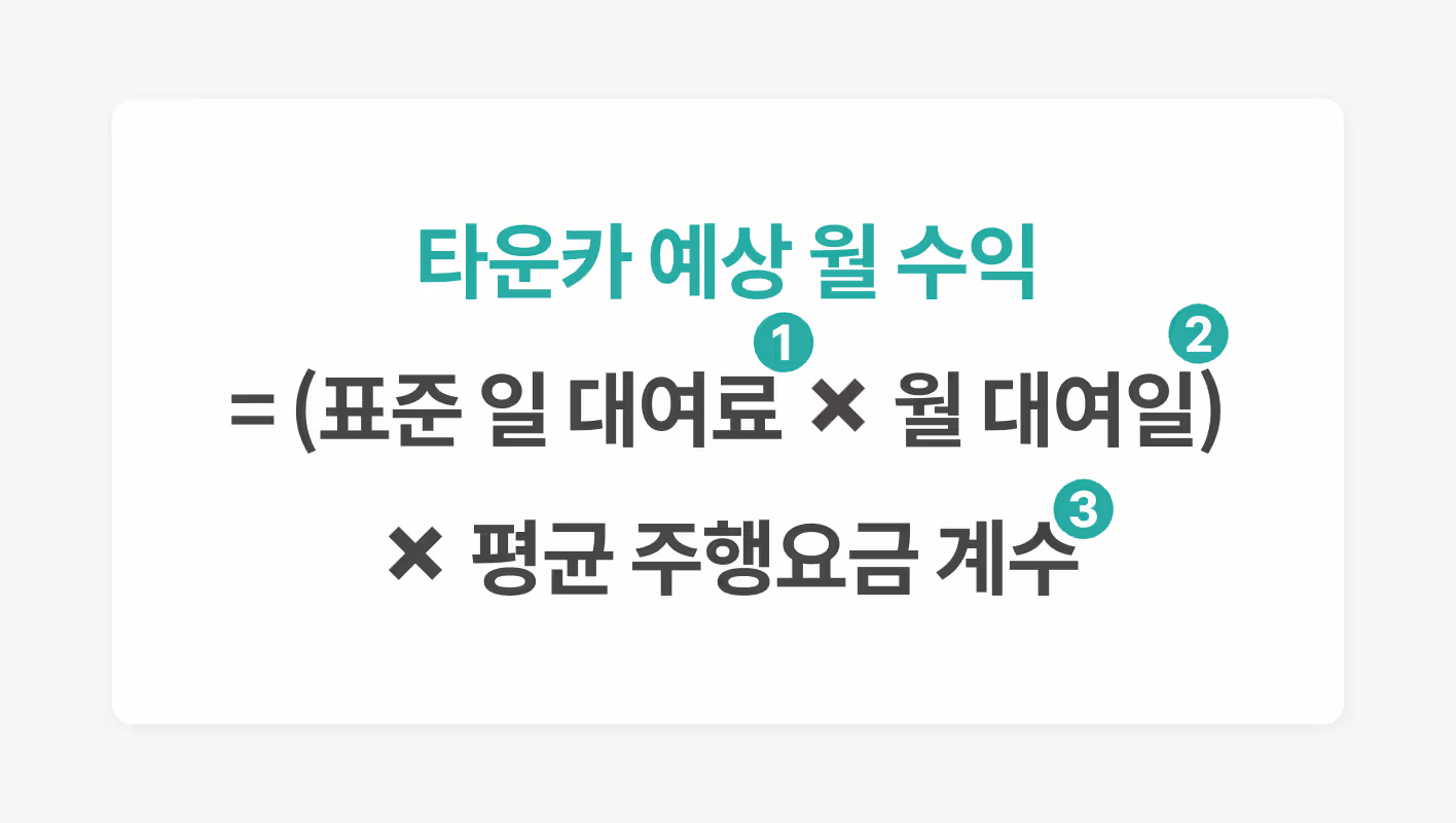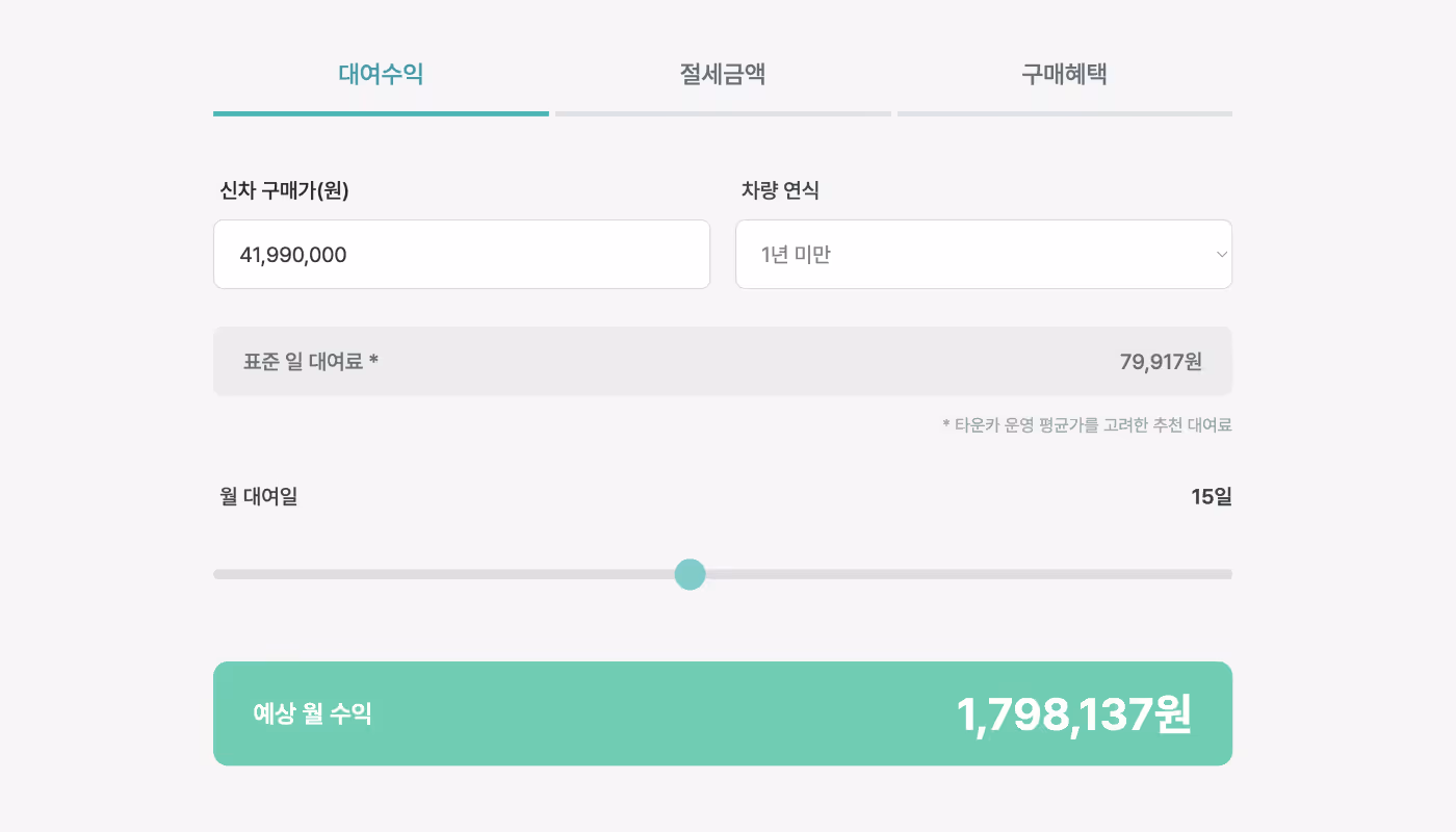 타운카 웹 페이지(내 차 공유하기 페이지↗︎)에는 계산기 섹션이 있는데요, 여기에 신차 구매가격과 차량연식을 입력하면 대략적인 타운카 운영 평균가를 고려한 추천 대여료를 확인하실 수 있습니다. 여기에 대여일수를 곱하면 월 수익이 어느정도인지 확인할 수 있겠죠?